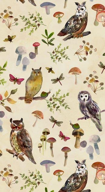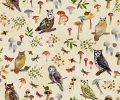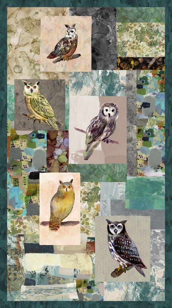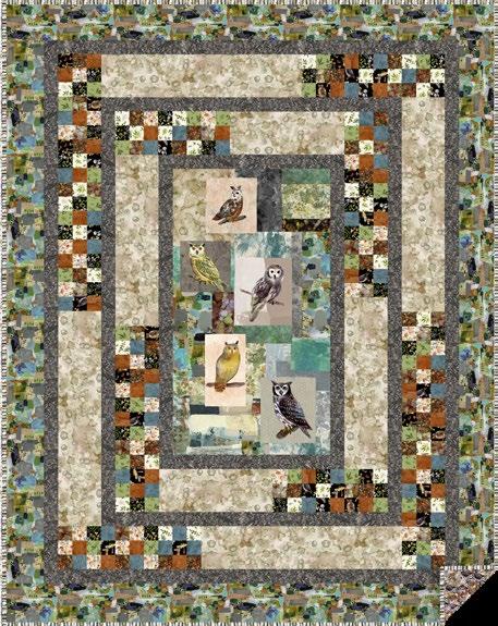 Fabrics: 1 Kit 10 Kits 20 Kits Panel: Multi Digital Panel Y4072-55 ⅔ yd 1 bolt 1 bolt Sashing: Lt Brown Digital Moss Stones Y4080-14 ¼ yd 1 bolt 1 bolt Accents: Multi Digital Abstract Collage Y4073-55 FE 1 bolt 1 bolt Black Digital Owls & Mushrooms Y4075-3 FE 1 bolt 1 bolt Lt Butter Digital Owls & Mushrooms Y4075-58 FE 1 bolt 1 bolt Olive Digital Fronds Y4077-24 FE 1 bolt 1 bolt Black Digital Forest Floor Y4078-3 FE 1 bolt 1 bolt Dk Caramel Digital Stones Y4082-66 FE 1 bolt 1 bolt Teal Digital Watercolor Tonal Y4083-104 FE 1 bolt 1 bolt Side Borders: Dk Pewter Digital Agate Y4084-120 ⅜ yd 1 bolt 1 bolt Top & Bottom Borders: Multi Digital Packed Owls Y4074-55 ⅝ yd 1 bolt 1 bolt Binding: Dk Rust Digital Watercolor Tonal Y4083-72 ½ yd 1 bolt 1 bolt Backing: Butter Digital Mushrooms Y4079-59 3 ½ yds 3 bolts 5 bolts