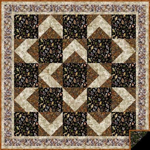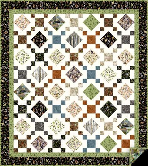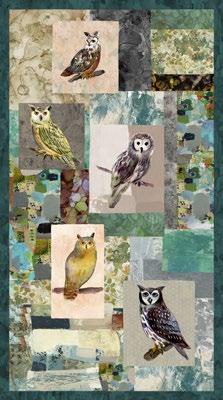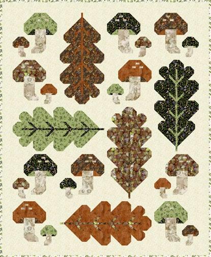 Fabrics: 1 Kit 10 Kits 20 Kits A. Multi Digital Panel Y4072-55 ⅔ yd 1 bolt 1 bolt B. Dk Pewter Digital Agate Y4084-120 1 ⅝ yds 2 bolts 3 bolts C. Khaki Digital Sandstone Y4081-12 1 ½ yds 1 bolt 2 bolts D. Accent Squares: Black Digital Owls & Mushrooms Y4075-3 FQ 1 bolt 1 bolt Lt Cream Digital Fronds Y4077-2 FQ 1 bolt 1 bolt Olive Digital Fronds Y4077-24 FQ 1 bolt 1 bolt Black Digital Forest Floor Y4078-3 FQ 1 bolt 1 bolt Butter Digital Mushrooms Y4079-59 FQ 1 bolt 1 bolt Lt Brown Digital Moss Stones Y4080-14 FQ 1 bolt 1 bolt Dk Caramel Digital Stones Y4082-66 FQ 1 bolt 1 bolt Dk Rust Digital Watercolor Tonal Y4083-72 FQ 1 bolt 1 bolt Teal Digital Watercolor Tonal Y4083-104 FQ 1 bolt 1 bolt E. Multi Digital Abstract Collage Y4073-55 1 ⅝ yds 2 bolts 3 bolts Binding: Brown Digital Birch Trees Y4076-15 ¾ yd 1 bolt 1 bolt Backing: Multi Digital Packed Owls Y4074-55 5 ⅓ yds 4 bolts 8 bolts