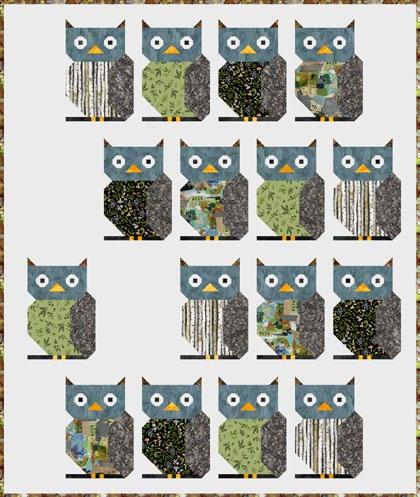 Fabrics, Pale Gray version: Fabrics, Muslin version: 1 Kit 10 Kits 20 Kits Background: Pale Gray Solid AMB-137 Background: Muslin Solid AMB-190 2 ⅜ yds 2 bolts 4 bolts A: Dk Pewter Digital Agate Y4084-120 A: Dk Rust Digital Watercolor Tonal Y4083-72 ½ yd 1 bolt 1 bolt B: Dk Gray Misty Y2539-7 B: Dk Pewter Digital Agate Y4084-120 ¼ yd 1 bolt 1 bolt C: Lt Orange Misty Y2539-35 C: Lt Orange Misty Y2539-35 ⅛ yd 1 bolt 1 bolt D: Dk Caramel Digital Stones Y4082-66 D: Teal Digital Watercolor Tonal Y4083-104 ⅛ yd 1 bolt 1 bolt E: Teal Digital Watercolor Tonal Y4083-104 E: Khaki Digital Sandstone Y4081-12 ¾ yd 1 bolt 1 bolt F: Brown Digital Birch Trees Y4076-15 F: Multi Digital Packed Owls Y4074-55 ¼ yd 1 bolt 1 bolt G: Olive Digital Fronds Y4077-24 G: Butter Digital Mushrooms Y4079-59 ¼ yd 1 bolt 1 bolt H: Black Digital Forest Floor Y4078-3 H: Black Digital Owls & Mushrooms Y4075-3 ¼ yd 1 bolt 1 bolt I: Multi Digital Abstract Collage Y4073-55 I: Dk Caramel Digital Stones Y4082-66 ¼ yd 1 bolt 1 bolt Binding: Lt Brown Digital Moss Stones Y4080-14 Binding: Lt Butter Digital Forest Floor Y4078-58 ½ yd 1 bolt 1 bolt Backing: Multi Digital Packed Owls Y4074-55 Backing: Lt Butter Digital Owls & Mushrooms Y4075-58 3 ¾ yds 3 bolts 5 bolts Owls See YouWendy Sheppard Finished quilt size: 49" 58"