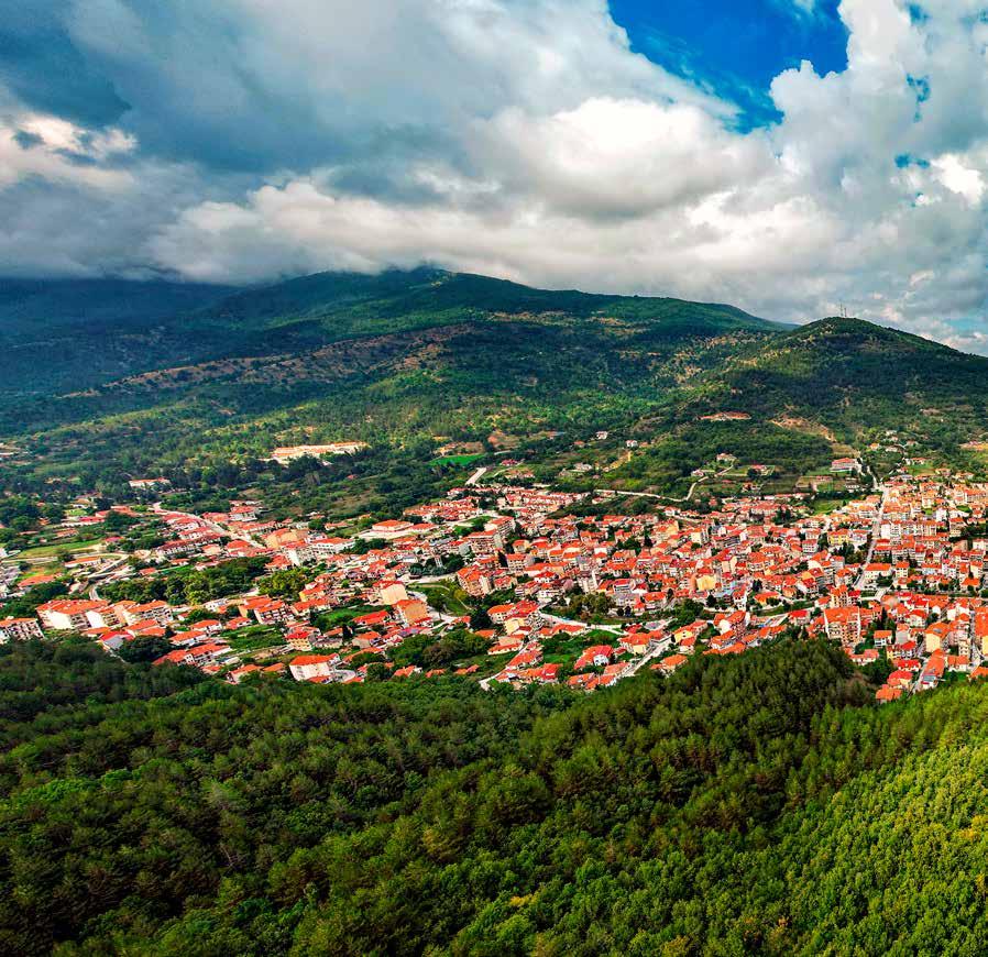 ριάς, με φόντο τα καταπράσινα βουνά του Γράμμου, του Σμόλικα και της Βασιλίτσας, μέχρι τις ροδακινιές του Βελβεντού και το Γεωπάρκο