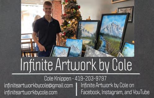 Fall 2022 Fred doesn’t throw away those rusted, busted, bent items, instead he uses his creativity and repurposes those materials into amazing pieces of art. You will find propane tanks made into pumpkins for the porch, mismatch pieces creating fun lamps and table art, plus unique wall pieces for the home. So, if you are trying to find something unique and special for that hard to shop for person on your Christmas list look no further and stop by Building FA Booth 31 to FH Fabs. Artist, Gilmara Hall was born in the city of São Paulo, Brazil. Her artwork is displayed grow her talents for the past 21 years. Her vivid colors and realistic, yet abstract work landscapes are some of what you can find Brilliant, Bright & Fabulous Art LOCATED ATLOCATED AT 400 W. MAIN CROSS ST.400 W. MAIN CROSS ST. AND 1217 TIFFIN AVE.AND TIFFIN AVE. IN FINDLAY.IN FINDLAY. FOR STORE HOURS VISITFOR HOURS VISIT DIETSCHBROTHERS.COM DIETSCHBROTHERS.COM Christmas Open House Nov 12 & 13 $5.00 OFF of a $30 Purchase 567.250.9944 1331 N. Main St. | Findlay, OH 45840 preterotisspaghettihouse@gmail.com