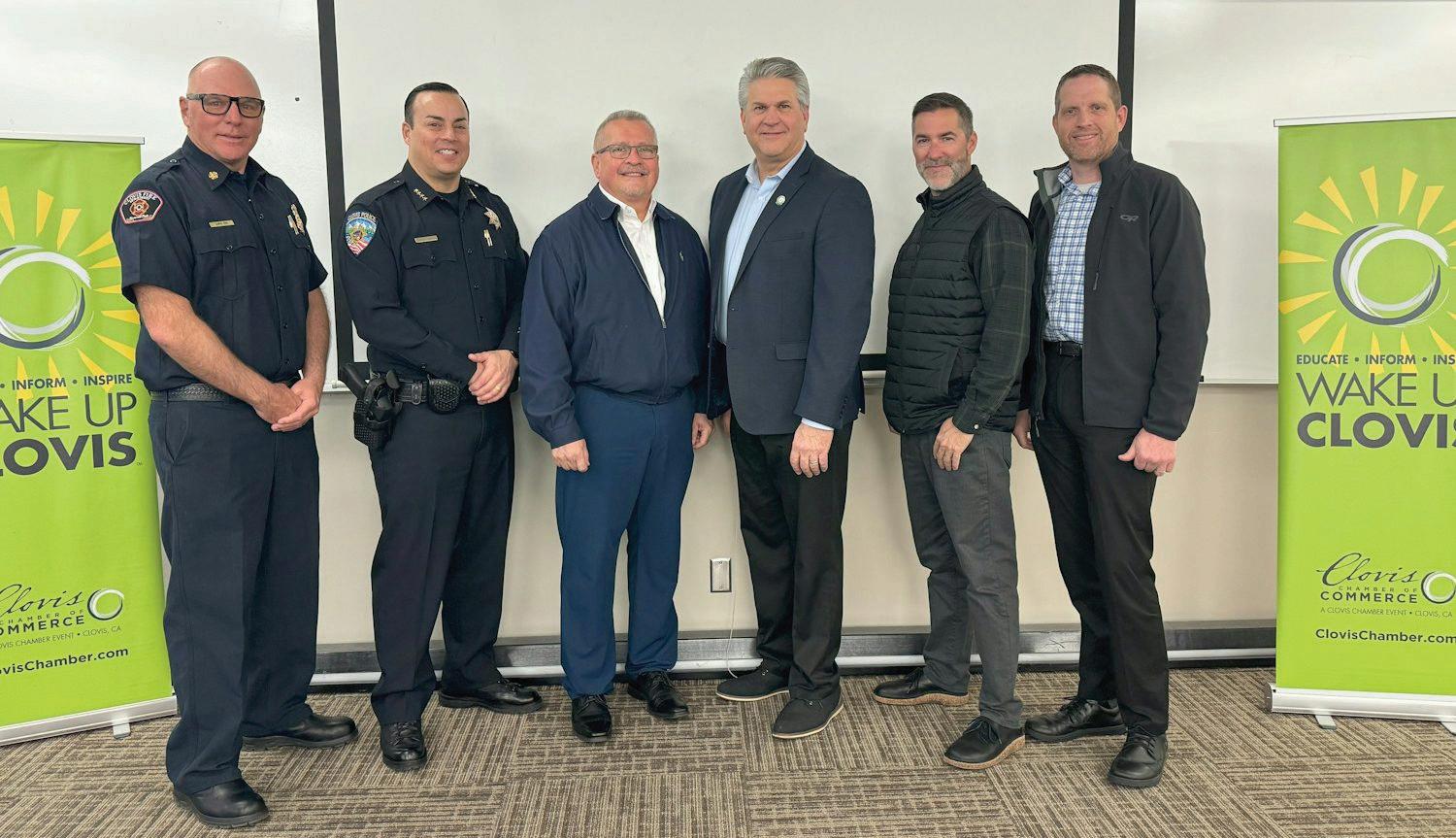 Photo courtesy of Chamber of Commerce Far left: Chief Chris Ekk, Clovis Fire Department; Chief Curt Fleming, Clovis Police Department; John Holt, Clovis City Manager; Greg Newman, Executive Director & CEO, Clovis Chamber of Commerce; Chad McCollum, Economic Development, Housing and Communications Director; Andy Haussler, Assistant City Manager, City of Clovis (Photo courtesy Clovis Chamber of Commerce)