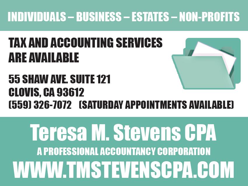 ACCOUNTING SERVICES: Teresa Stevens, CPA (559) 326-7072 teresa@tmstevenscpa.com