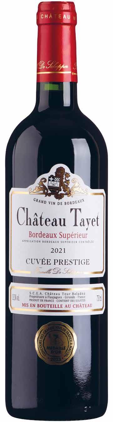 Prestige du Château Tayet offre un rapport qualité-prix imbattable dans le Médoc. L’utilisation de 50 % de barriques neuves durant 12 mois d’élevage, le tri à la vendange et l’augmentation progressive de la proportion de Petit Verdot ont permis d’obtenir un Bordeaux Supérieur nettement au-dessus de la moyenne.