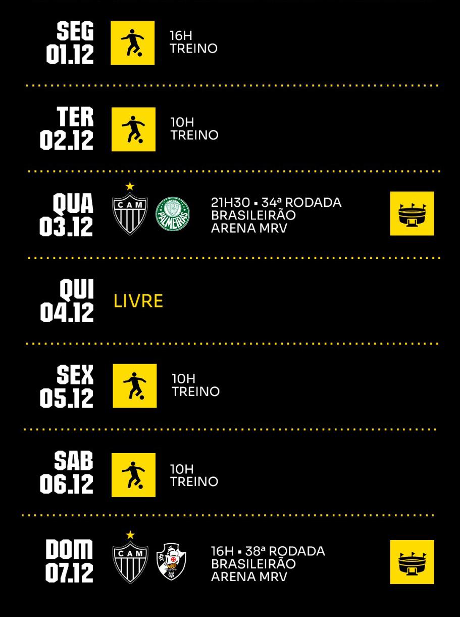 • O Atlético enfrenta o Palmeiras, na Arena MRV, em jogo remarcado da 34ª rodada do Brasileirão. O Galo soma 45 pontos em 36 partidas, ocupando o 13º lugar.