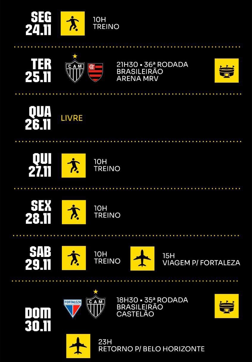 • O Atlético enfrenta o Fortaleza, na Arena Castelão, pela 35ª rodada do Brasileirão. O Galo soma 45 pontos em 35 jogos, ocupando o 12º lugar. A equipe vem de empate contra o Flamengo, em 1 a 1, na Arena MRV.