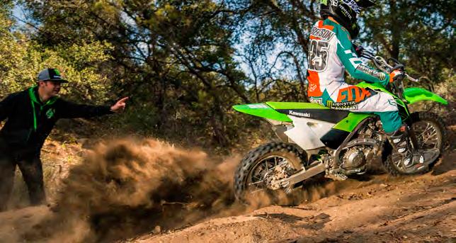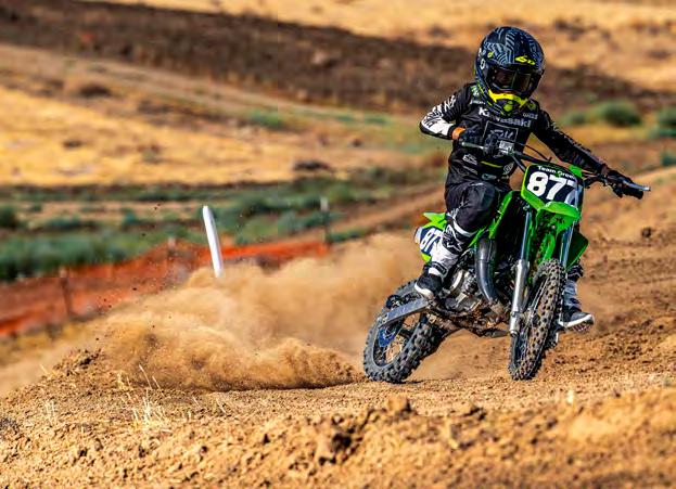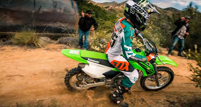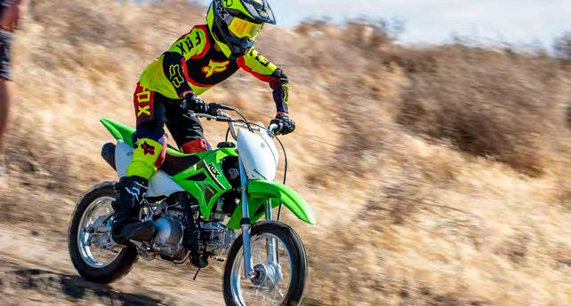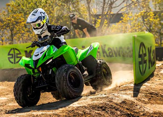 SPECIFICATIONS Engine type Compression ratio Valve system Displacement Air-cooled, 4-stroke Single 9.5:1 SOHC, 2 Valves 144cm³ Engine Brakes and Suspension Frame and Dimensions Frame type Trail Front tyre Rear tyre Fuel capacity Seat height Ground clearance Curb mass L x W x H AVAILABLE COLOURS Lime Green KFX90 £3,299 Double Cradle, steel 15 mm AT18X7-8 AT18X9-8 5.3 litres 150 (frame 100 (swingarm) mm 122 kg 1,425 x 905 x 925 mm