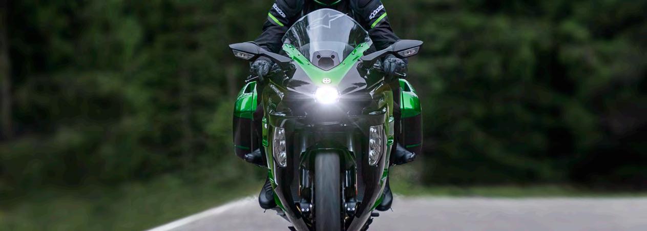 Front Brakes Rear Brakes Front Suspension Rear Suspension Trellis, high-tensile steel with swingarm mounting plate 120/600 R17 190/650R17 17 litres 830 mm 216 kg 2,070 x 850 x 1,160mm Mirror Coated Matte Spark Black Economical Riding Indicator KQS (Kawasaki Quick Shifter) Supercharged Engine ERGO-Fit KCMF Kawasaki Engine Brake Control ABS KIBS KLCM Silver Mirror Paint IMU Electronic Throttle Valves KTRC-3