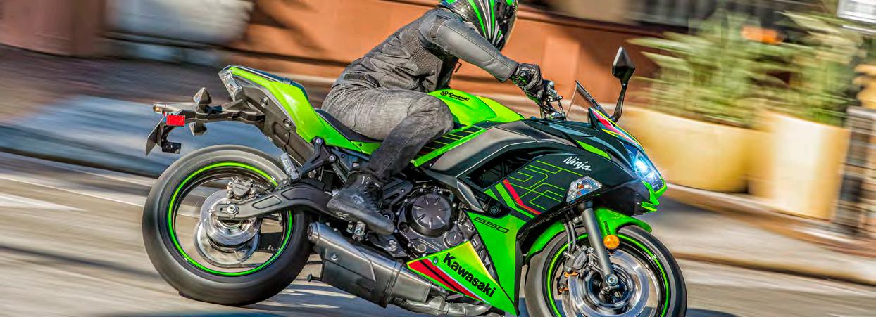 6 *Key to technology items on back page NINJA 650 £7,649 7,500 miles service intervals or an annual service. Accessory prices are subject to change. Price includes VAT at 20%, delivery to dealer and preparation of motorcyde. Government charges are charged in addition. Technologies* Economical Riding Indicator Smartphone Connectivity Assist & Slipper Clutch Colour Options £7,799 Lime Green / Ebony Metallic Matte Graphenesteel Grey/Ebony £7,649 Engine type Valve System Displacement Front Brakes Rear Brakes Front Suspension Rear Suspension Max Torque Max Power CO2 Emission Fuel Consumption Fuel Consumption 35 kW CO2 Emission 35 kW Kit Liquid-cooled, 4-stroke Parallel Twin DOHC, 8 valves 649 cm³ Dual semi-floating 300 mm petal discs. Caliper: Dual piston Single 220 mm petal disc. Caliper: Single-piston 41 mm telescopic fork Horizontal Back-link with preload adjustment 64 N•m {6.5 kgf•m} @6,700 rpm 50.2 kW {68 PS} @8,000 rpm 107 g/km 65.6mpg 62.7 mpg 107 g/km ENGINE FRAME AND DIMENSIONS BRAKES AND SUSPENSION PERFORMANCE Frame Type Front Tyre Rear Tyre Fuel Capacity Seat Height Curb Mass L x W x H Trellis, high-tensile steel 120/70ZR17M/C (58W) 160/60ZR17M/C (69W) 15 litres 790 mm 193 kg 2,055 x 740 x 1,145 mm A2 Licence Compliant ABS Horizontal Back-Link Rear Suspension Dual Throttle Valves Ninja 650 Performance - from £9,249 Ninja 650 Tourer - from £8,349 Editions KTRC (3-Mode)