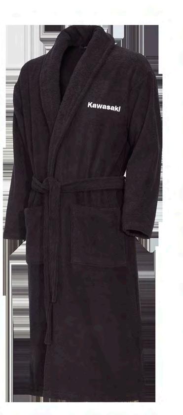 This 100% cotton bathrobe is just the right attire for lounging around the house. Black bathrobe with pockets Embroidered with Kawasaki logo on back and front 100% cotton terry Available in sizes S/M & L/XL