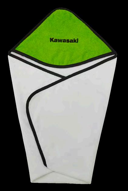 RRP £17.95 This 100% terry towel with hood is a must-have for bath times! White Hooded towel Dimension: 75 cm x 75 cm Edge trimmed in black Hood in Kawasaki green Branded with Kawasaki logo embroidery 100% Cotton