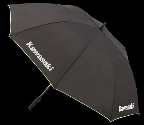 Take shelter under this black Kawasaki umbrella. Decorated with a Kawasaki logo printed in white on alternate panels and a lime green piping.