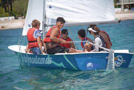 de fauna marina. En este barco los niños y niñas están aprendiendo cuales son las zonas de fondeo, el conocimiento de la zona, los tipos de fondeos de embarcaciones, la gestión de los residuos a bordo, recogida con salabre de residuos flotantes, etc, todo ello con el objetivo de formar a los futuros patrones y navegantes en el cuidado del medio marino.