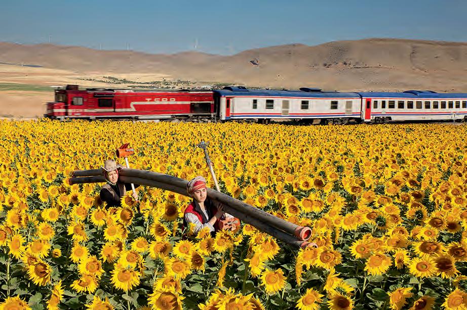 La imagen de un tranvía que transita a ritmo lento por los campos de girasol de Konya (Turquía).