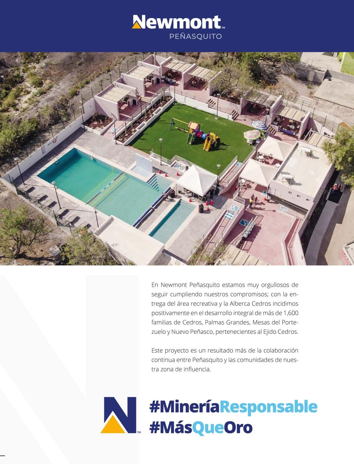 Quienes formamos parte de Newmont, estamos comprometidos con seguir contribuyendo al desarrollo de México y de Zacatecas, generando valor y mejorando la vida de las personas haciendo minería responsable. Esto se traduce en 5,000 empleos directos formales bien remunerados y 28,000 indirectos; la integración de más de 250 proveedores locales a nuestra cadena de valor, y una inversión social de 34 millones de pesos anuales en beneficio de las más de 5,000 familias que viven en las 25 comunidades que conforman la zona de influencia de Peñasquito.