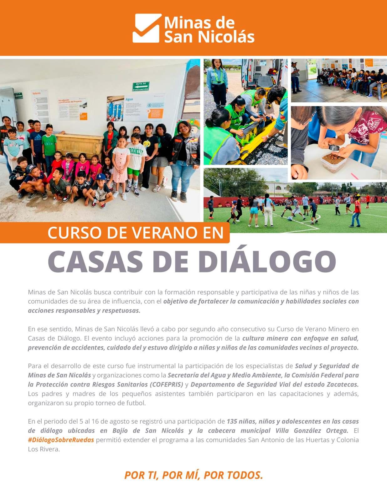 La empresa ofreció pláticas a estudiantes de primaria y secundaria sobre seguridad, primeros auxilios y cuidado del ambiente. También se presentó la charla "La minería en la vida cotidiana para niños", que explicó la importancia de la minería y la seguridad en el trabajo. Para jóvenes de preparatoria y universidad, se impartió la charla "En la minería…¡tod@s cabemos!", que mostró la diversidad de oportunidades laborales en el sector.