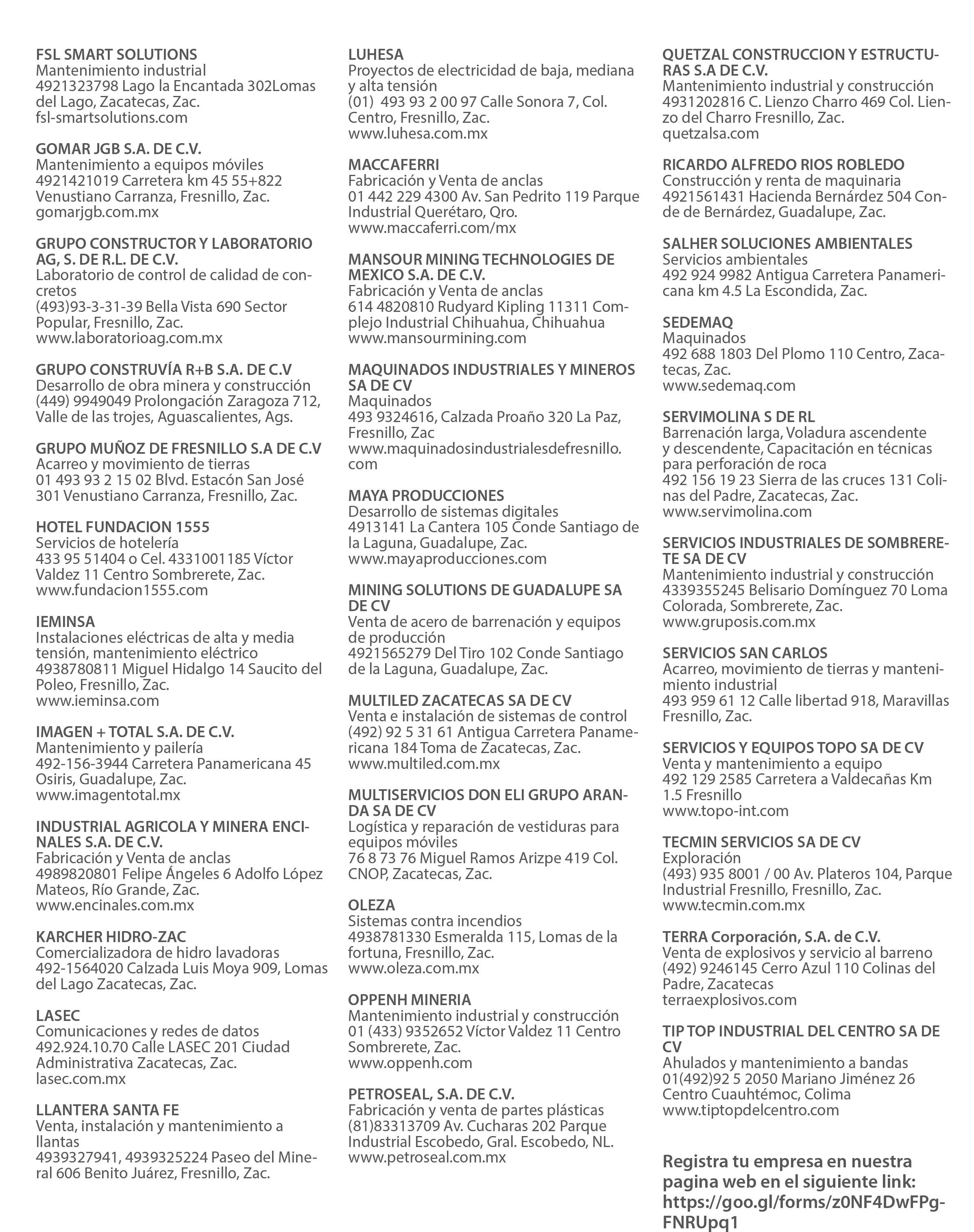 Espero pues que esta edición sea de su agrado y les genere un interés puntual en las actividades que el Clusmin y las compañías que lo conforman, realizan con el objetivo de mostrar una minería competitiva y de clase mundial desde Zacatecas a todos los continentes.