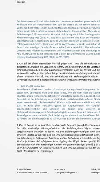 Die Gewerkschaft Pflichtschullehrerinnen und Pflichtschullehrer bekennt sich ausdrücklich und uneingeschränkt dazu, individuelle Entwicklungsmöglichkeiten und autonome Selbstbestimmungsrechte von Kindern zu unterstützen und weiter zu stärken. Es wird von uns aber unmissverständlich darauf hingewiesen, dass Schulen ausschließlich Bildungseinrichtungen mit klarem pädagogischem Auftrag und keinesfalls Kontrollinstanzen mit sicherheitspolizeilichen oder verwaltungsstrafrechtlichen Aufgaben sind!