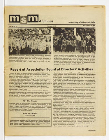 Report of Association Board of Directo rs" Activities Despite the state of the economy, donations to the MSM-UMR Alumni Association continued to rise this year. And new Association President, Larry Spanier, '50, and the Board of Directors know what to do with that extra money--give more student scholarships. After newly elected Secretary, Martha Gerig, '69, reported that all nominees for officers and directors had been elected, it was decided at the October I meeting of the MSM-UMR Alumni Association Board of Directors, that student aid would be increased in two ways. First, the Association allocated $4,000 to be used for MSM-UMR Alumni Association Athletic Scholarships. That amount should go a long way in providing the 28 additional athletic scholarships authorized under MIAA conference rules, but presently not given to UMR athletes becaise of a lack of funds. In a separate action, the Board voted to increase the amoun~ of existing AsSociation scholarships and the Educational Assistant program to $86,250 for the 1983-84 budget. The 1982-83 budget calls for $67 ,500. As part of the increase, students will be asked to consider 25 percent of their scholarship award as a loan to be repaid to the Association within two years of graduation.