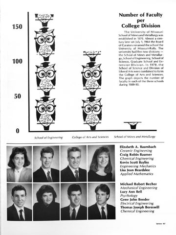 The University of Missouri School of Mines and Metallurgy was established in 1870. Almost a century later on July 1, 1964 the Board of Curators renamed the school the University of Missouri-Rolla. The university had five new divisions the School of Mines and Metallurgy, School of Engineering , School of Science, Graduate School and Extension Division. In 1970, the School of Science and Division of Liberal Arts were combined to form the College of Arts and Sciences. The graph depicts the number of faculty in each of the three schools during 1989-90.