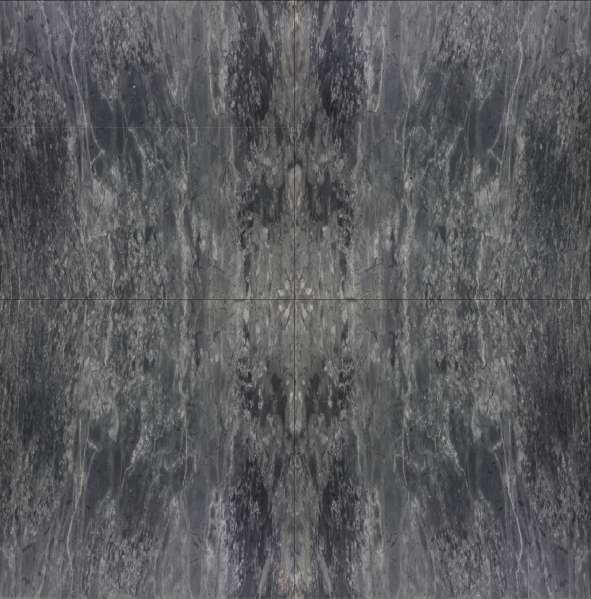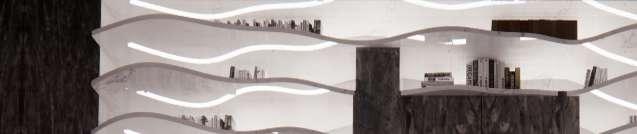 Undulating bright marble formations emerge from a dark, smooth marble background, creating openings that house books