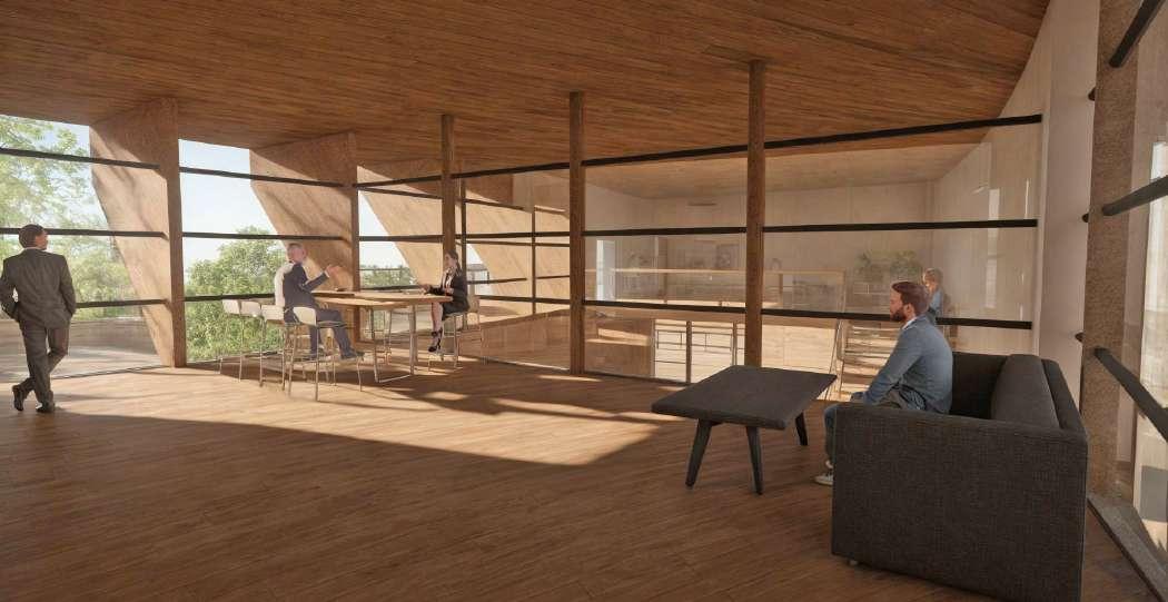 The lounge overlooks the public cafe, providing workers with a visual and mental break from the office environment