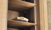 Detalle interior de armario modelo E en acabado textil. Iluminación Zeta integrada.