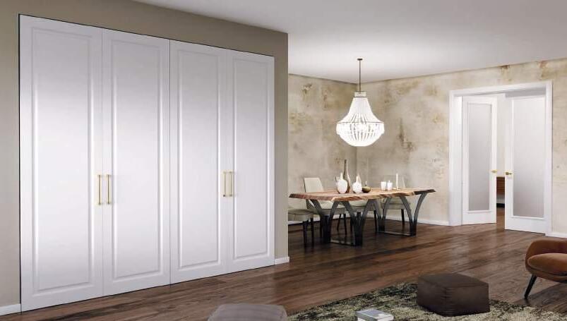 Armario abatible suelo-techo de 4 hojas. Frente modelo Fontana RTL, acabado lacado Blanco Castalla. Tiradores modelo Trama, latón oscuro satinado.