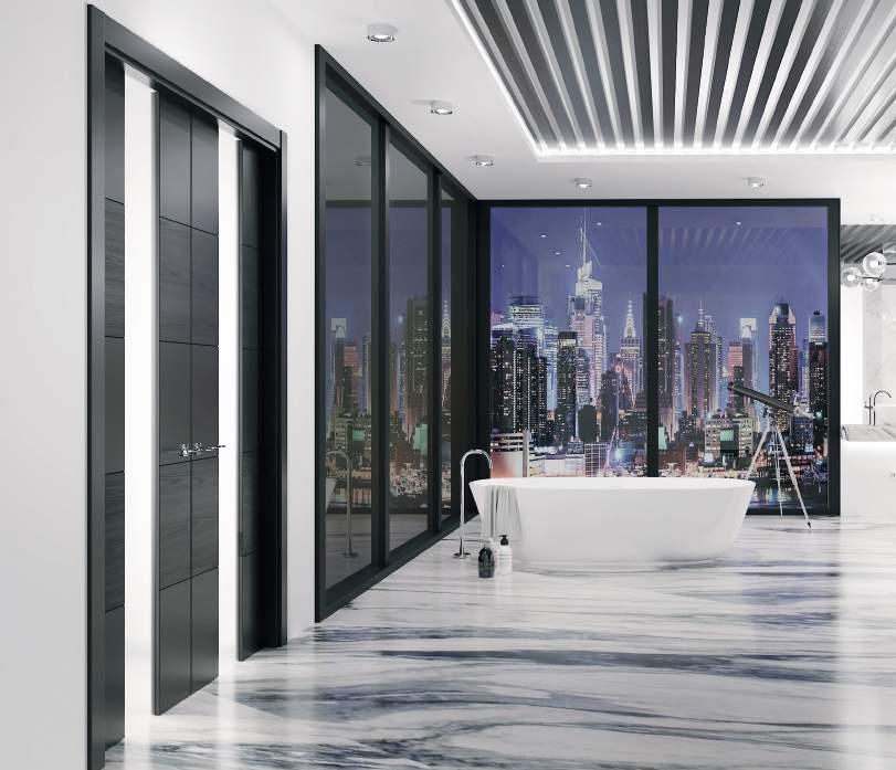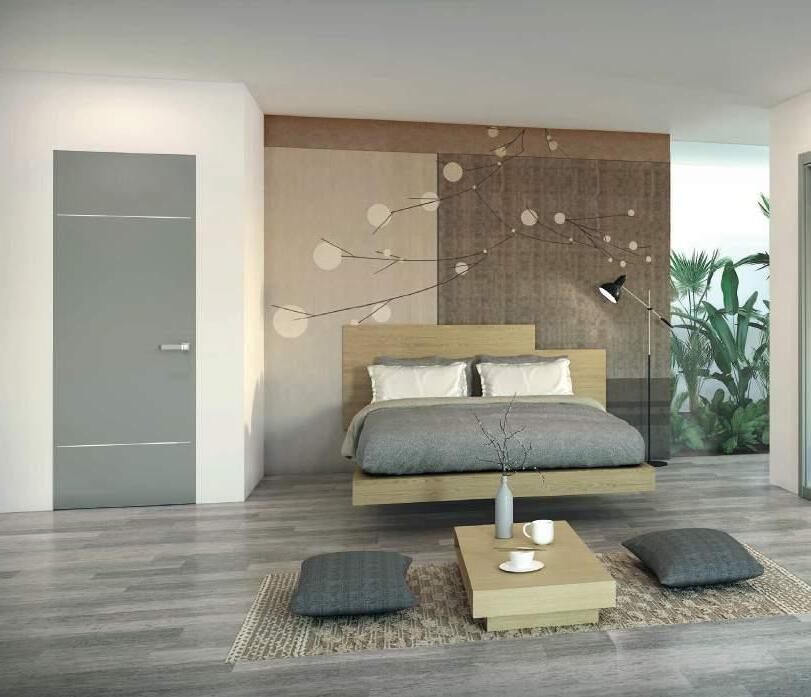 Puerta modelo Albana acabado marengo. Manilla modelo Wall R8C acabado cromo satinado. | Mural decorativo modelo Flake.