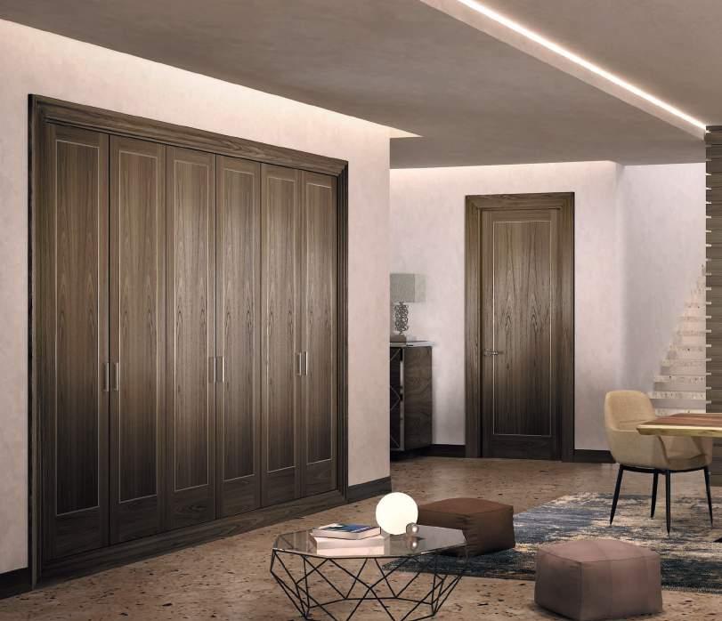6-leaf folding wardrobe with TAP side architraves. Zafiro front model, stain 1139 finish. Blade handle model, matt chrome finish.