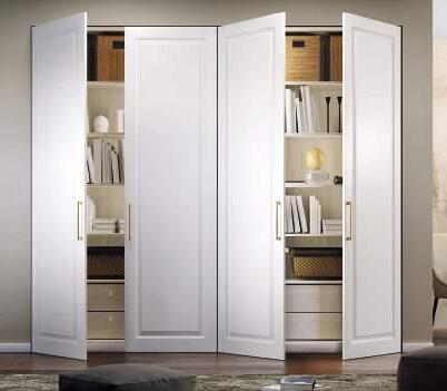 4-leaf floor-ceiling folding wardrobe. Fontana model front, finish: Castalla White. Trama handle model, satin dark brass.