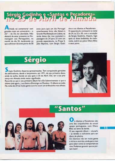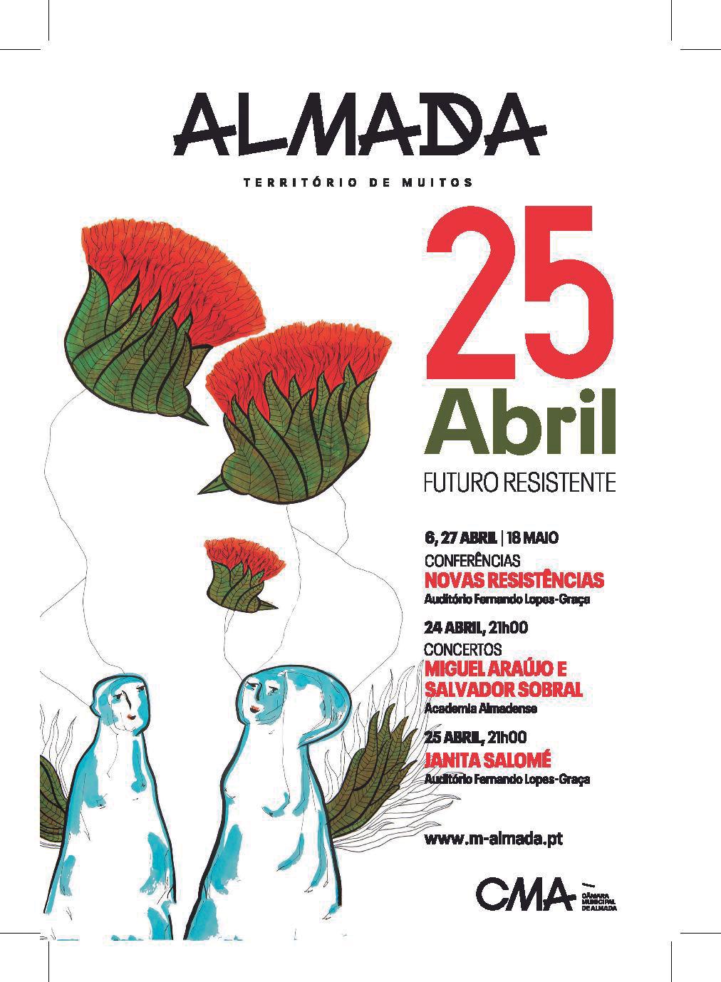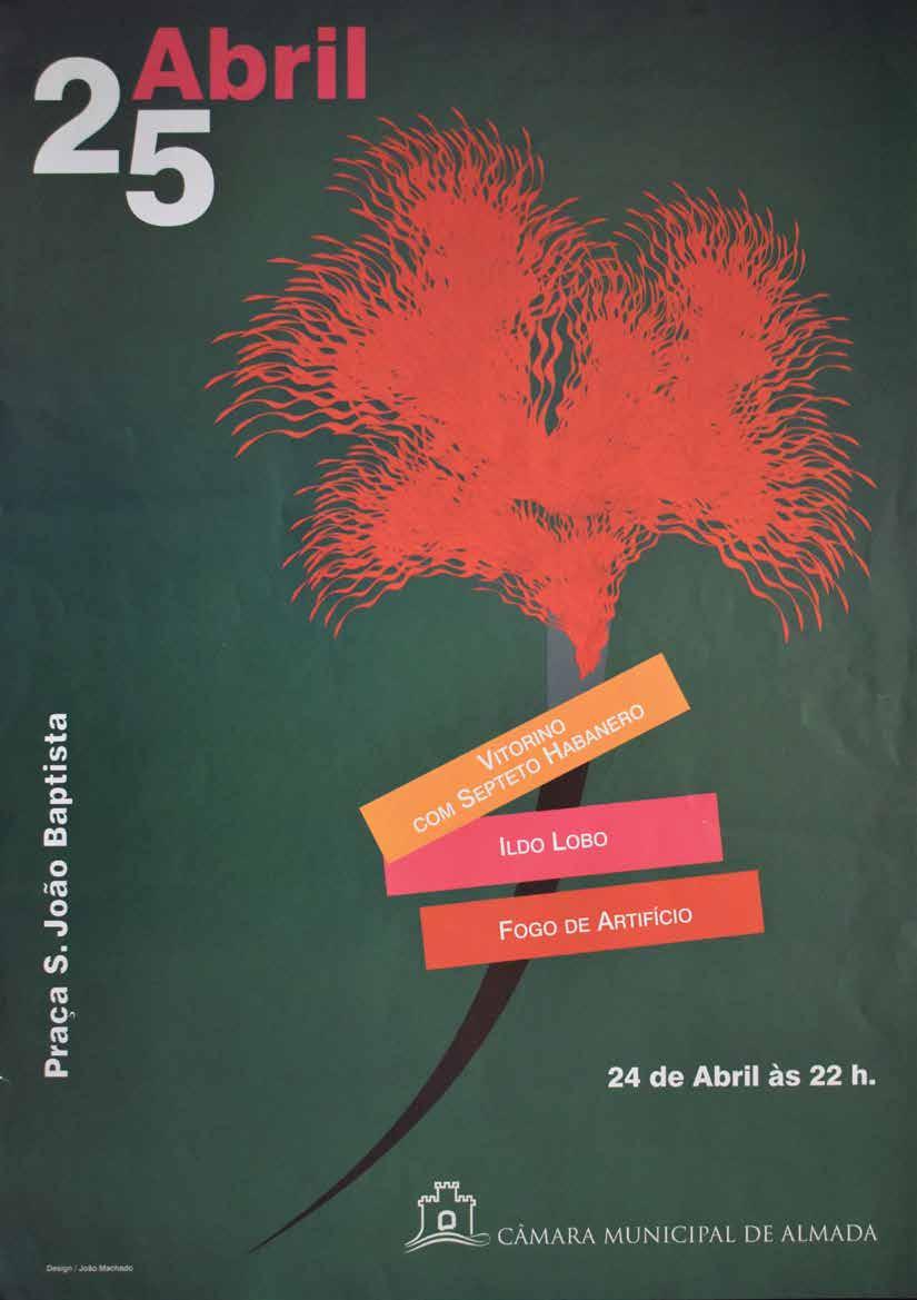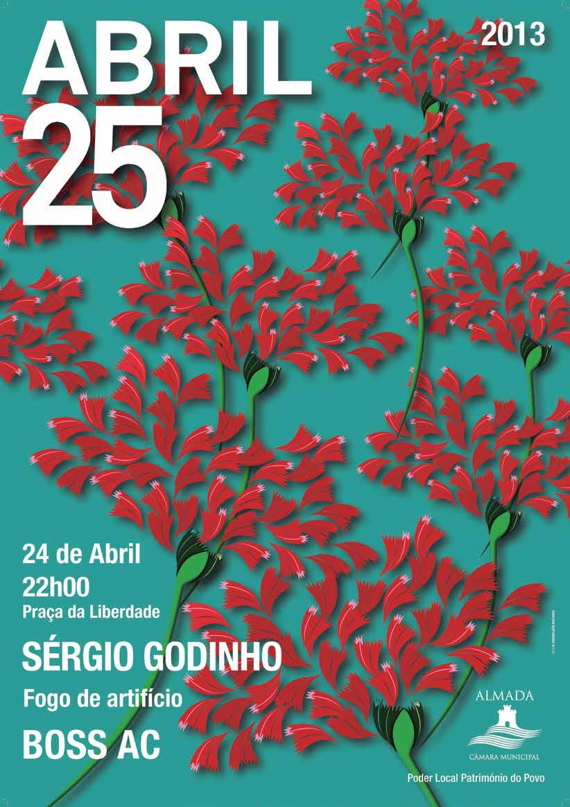 1 Cartaz de divulgação com o programa das comemorações do 25 de abril, 2013. Arquivo Histórico Municipal de Almada, Câmara Municipal de Almada, Cartazes, n.º 12983. 2 Espetáculo de Sérgio Godinho, nas comemorações do 25 de abril em Almada, 2013. Arquivo Histórico Municipal de Almada, Câmara Municipal de Almada, Fotografias, n.º 13112. 2