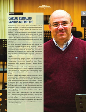 CARLOS REINALDO SANTOS GUERREIRO Carlos Reinaldo Santos Guerreiro, diretor artístico da Orquestra de Câmara de Almada (OCA), maestro, músico e professor nas escolas da Orquestra Metropolitana de Lisboa (OML), é detentor de um invejável currículo na área da música. Começou a estudar música aos oito anos de idade na Sociedade Filarmónica Operária Amorense (SFOA), Seixal, onde se iniciou com o eufónio, um instrumento de sopro. Mas foi sob a influência de Glenn Miller, famoso trombonista norte-americano, e da sua Orquestra que o maestro Carlos Reinaldo Guerreiro optou pelo trombone. Os movimentos associativos e as suas bandas estiveram presentes no seu crescimento enquanto músico, tendo passado pela SFOA, pela Sociedade Filarmónica Incrível Almadense e pela Sociedade Recreativa Musical Trafariense. Foi pelo trabalho desenvolvido nesta última coletividade, durante 15 anos, que recebeu a Medalha de Ouro de Mérito Cultural atribuída pela Câmara Municipal de Almada em 2008. Confessa que «não estava à espera desta distinção uma vez que era bastante novo». Na altura tinha apenas 38 anos. Aos 18 anos entrou na Banda do Exército, onde permaneceu durante mais de duas décadas. Nesta instituição exerceu funções de Trombone Solo e ensinou várias disciplinas nos cursos aí ministrados, como Música de Câmara ou Análise e Técnicas de Composição. A sua formação passou pela Escola de Música do Conservatório Nacional, onde concluiu o 8.º grau de Trombone, e pela Academia Nacional Superior de Orquestra (ANSO), onde concluiu os cursos superiores de Instrumentalista de Orquestra e de Direção de Orquestra. Hoje com 45 anos, Carlos Reinaldo Guerreiro ensina cerca de 100 alunos na ANSO e na Escola Profissional Metropolitana, ambas ligadas à OML. O ensino é uma das suas paixões. «Ter oportunidade de passar conhecimento aos jovens é um privilégio. O ensino é uma forma de fazer crescer as pessoas, dando-lhes uma base para progredir na vida». O facto de na sua juventude não ter tido um acesso facilitado ao ensino das artes, nomeadamente da música, engrandece o gosto e a vontade de ensinar. Ressalva, no entanto, o grande progresso feito nas últimas décadas no acesso à aprendizagem desta arte. Na OCA tem a cargo a direção artística onde, entre outras tarefas, é responsável pela organização da orquestra, pela definição da programação ou pela escolha de maestros. Sobre esta nova orquestra, que teve a sua estreia com o Concerto de Ano Novo na Academia Almadense, o maestro afirma que «faz parte da filosofia do projeto poder proporcionar um trabalho digno a jovens músicos e maestros portugueses».