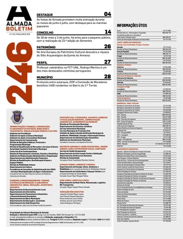 Propriedade da Câmara Municipal de Almada Redação e Administração CMA Largo Luís de Camões 2800-158 Almada Tel.: 212 724 000 e-mail: almadainforma@cma.m-almada.pt Redação, paginação e fotografia CMA Execução Gráfica Ancestra, Indústria Gráfica Lda. Tiragem 80 000 exemplares Depósito Legal N.º 76448/94 ISSN 1645-9903 Publicação isenta de registo na ERC ao abrigo do Decreto Regulamentar n.º 8/99, de 9 de junho, art.º 12.º, n.º1b) Textos escritos ao abrigo do novo Acordo Ortográfico