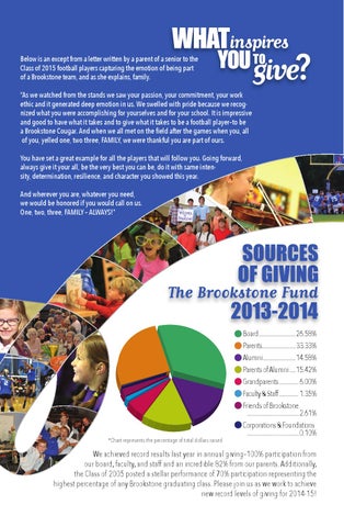 Board �������������������������26.58% Parents �����������������������33.33% Alumni ����������������������14.58% Parents of Alumni.....15.42% Grandparents ������������� 6.00% Faculty & Staff ������������� 1.35% Friends of Brookstone ....................................2.61% Corporations & Foundations . ....................................0.10%