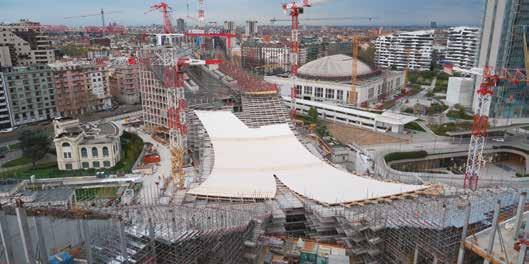 prevede un rivestimento metallico impermeabile in Riverclack, un campo fotovoltaico con celle in vetro customizzate per il progetto e un controsoffitto in legno per l’intradosso. Nel frattempo, in cantiere prosegue la posa delle facciate, che hanno subito una modifica importante rispetto al progetto originale: l’eliminazione dei balconi. Lo studio BIG ha saputo trasformare questa variazione in un punto di forza, integrando il sistema di raccolta delle acque meteoriche nella facciata stessa. L’alternanza di vetrate e pannelli in pietra ricomposta, con fasce marcapiano orizzontali, dona movimento e ritmo all’intero prospetto.
