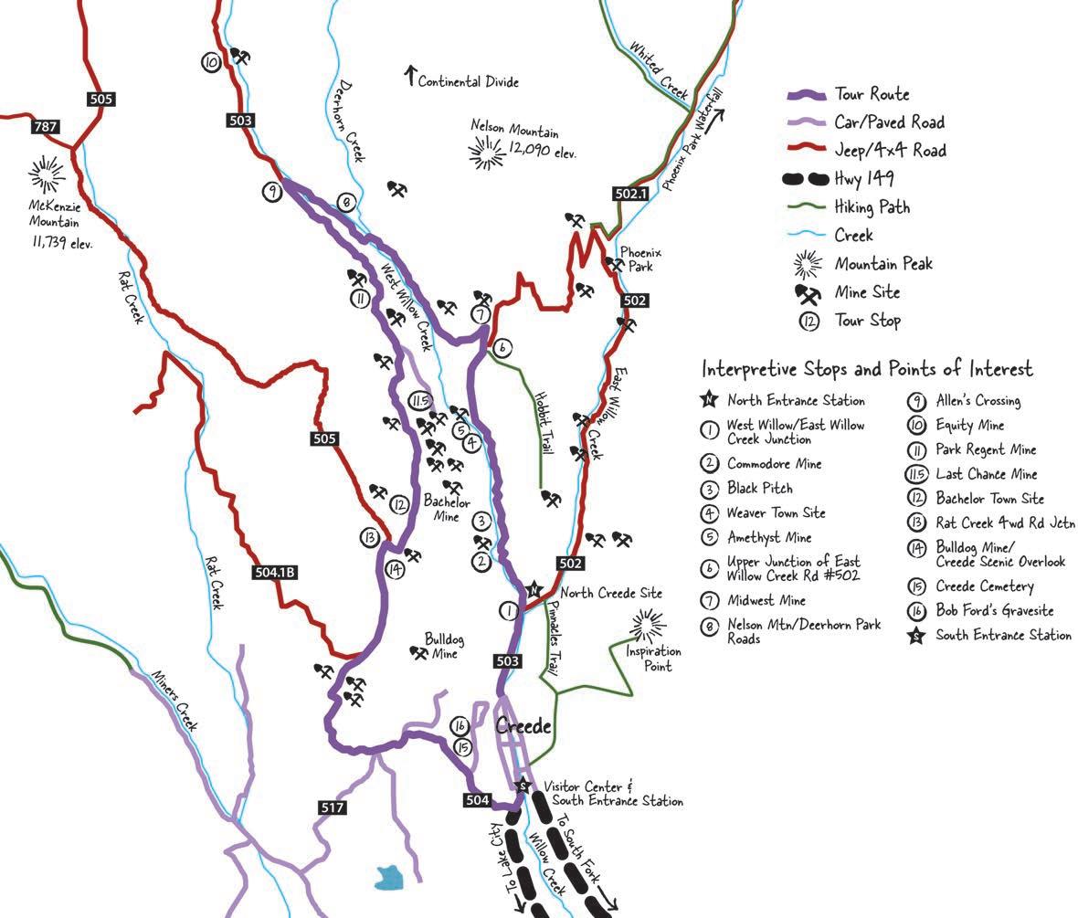 Three quarters of a mile later and 800 feet up, you’ll reach the pinnacles that tower above Main Street. Find a rock and take a break while you look down on town and the valleys of the Creede Caldera. If you’re hiking with younger kids, head back the way you came. Otherwise descend the “over” side, through pine trees and along the mountainside - there are a few steep drop-offs that require atten tive hiking. Keep right at two forks to come down into East Willow and North Creede. From there, stroll less than a mile downhill back to town.