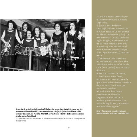 “El ‘Palace’ estaba decorado por el mismo que decoró el Palacio Legislativo. El furor acá era Pellejero. Cada café tenía sus habitués. En el Palace estaban ‘La barra de los resfriados’ (debajo del palco), ‘La mesa redonda’. Cuando teníamos algún ‘dragón’, le decíamos a los de ‘La mesa redonda’ a ver si lo aceptaban y ellos nos decían sí o no. Porque eran todos amigos. Eran Lagos, Bononini [...] toda una barra. Trabajábamos toda la semana, no teníamos día libre. En el 37 o 38 salimos todos los músicos a la calle (en el centro) para reclamar día libre. Antes nos trataban de menos, si ibas a tocar a una fiesta, estábamos en la cocina, parecía que si eras música tenías la tarjeta de prostituta. Te miraban por encima del hombro. Mi madre nos iba a buscar y veníamos en el tranvía. Llegábamos a las dos de la mañana y teníamos dos o tres autos de seguidores que además nos mandaban regalos”. Orquesta de señoritas. Palco del café Palace. La orquesta estaba integrada por las hermanas Liria Goñi (violín) y Pocha Goñi (contrabajo), bajo la dirección de Élida Gómez y Dolores S. de Parente. Año 1934. (Foto: Museo y Centro de Documentación de Agadu. Autor: Foto Silva) El café Palace estaba ubicado en la Plaza Independencia (entre el Palacio Salvo y la Casa de Gobierno).