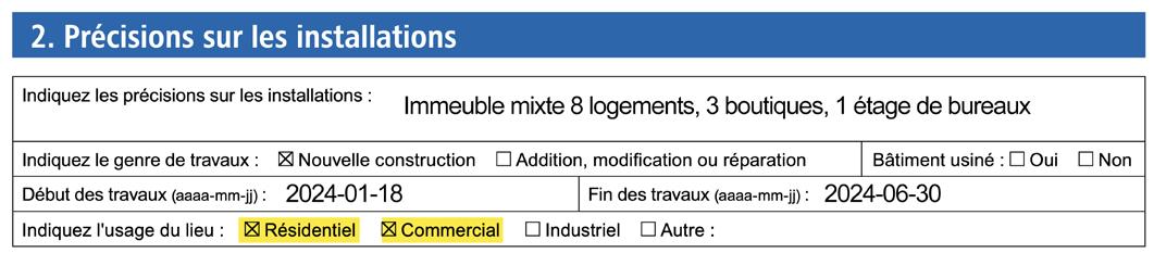 Une seule déclaration par bâtiment est nécessaire. Dans ce cas, il faut préciser qu’il s’agit d’une nouvelle construction dans la section 2. Précisions sur les installations. Il faut également indiquer les dates de début et de fin prévue des travaux. Puisque les travaux débutent à la mi-janvier, la déclaration doit être envoyée avant le 20 février. Aussi, cochez