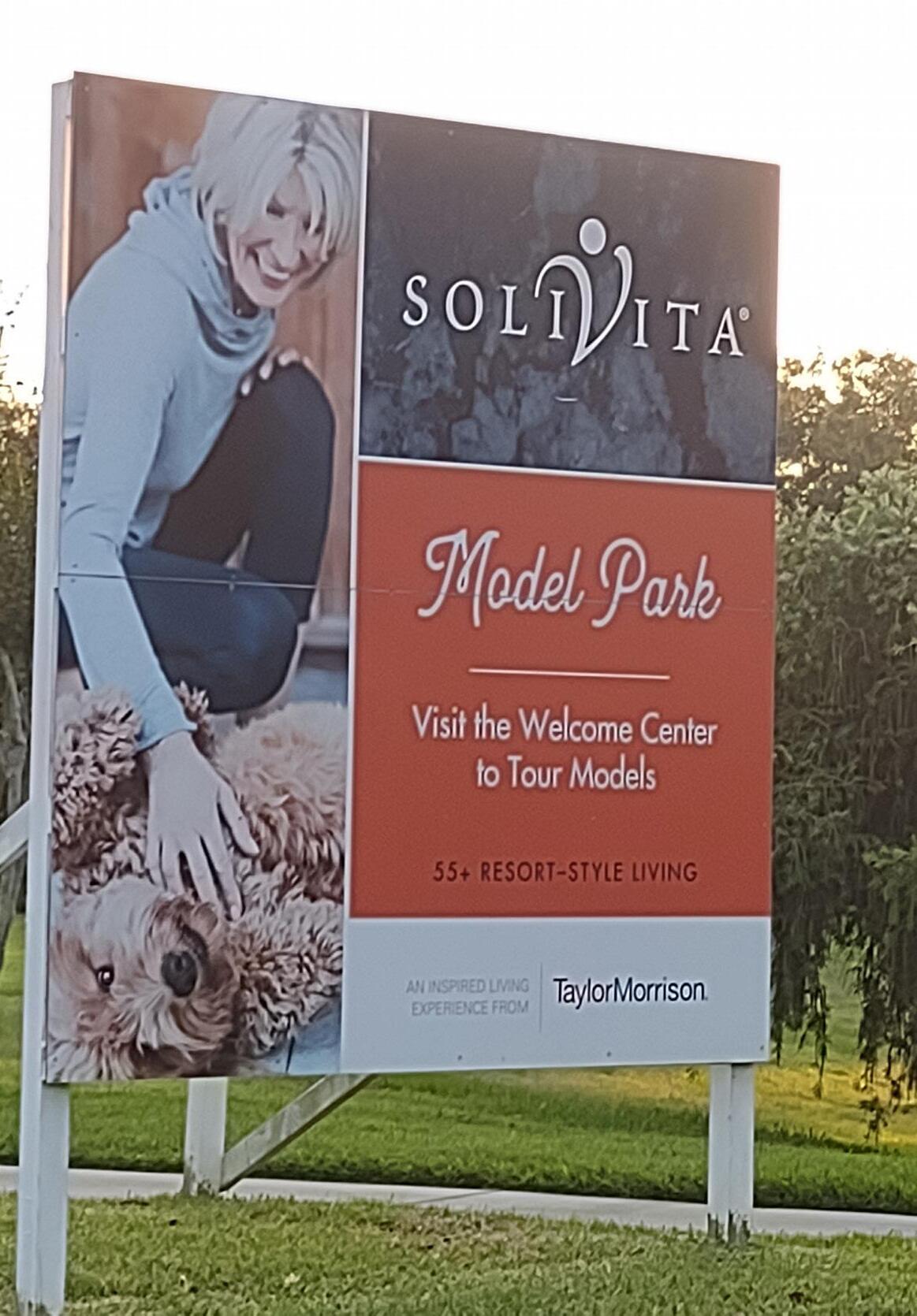 I went to visit my Nanny, my mom’s mom, May 26th-29th. She lives in Solivita. Within Solivita there are little communities, those that have a “V” are designed just as the “V” in the photo shows (e.g., Terra Vista, Treviso, Alta Vista, etc.). I took this photo rather than one of the monument signs because of the mix of a softer font with a more rigid one. It reflects the stylized “V” nestled between the I’s within the capitalized, loosely tracked “Solivita”. The text is easy to read, and it is memorable. It helps a bit that there is also a Solivita Marketplace just across from the group of communities, the signs all bear the same style and it brings consistency to the whole area. The softer cursive of “Model Park” draws your eye down gently to show the offer of a tour through a model. Just below, in capitalized contrasting dark font, the “55+Resort-Style-Living” politely and firmly tells us this is a retirement community. Lastly, and lightly, the owner’s name. I think this sign is very well put together. It feels clean, it’s easy to read, and there’s a dog to look at. All jokes aside, it feels effortless, and it takes effort to give that kind of air.