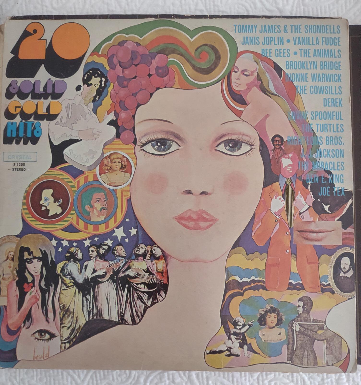 This was a record at my Nanny’s (my mom’s mom), and is my example of bad typography this week. Before I go on, I do like the overall design of this piece. My main focus will be on the last of the names written in blue (or teal?), primarily the bottom seven. The color choice doesn’t work, the colors are complimentary, but the contrast is too high and causes issues with readability. If the artist had played with shades and tints within the color scheme, they might have been able to resolve the problem with a very slight adjustment. Otherwise, if the text was not placed in front of the images making up the woman’s hair, I think it might have resolved this. I believe the text was kept in its place to flow and reflect the shape of the text on the left side of the cover and to fill the space, but that’s just my guess. This is definitely a busy piece of art, and while most of it works, the one little issue with the text being hard to read really pulls away from the whole design. I do want to add in that the fun font chosen for “20s solid gold hits” suits the theme of the design very well, the colors go well and the funky shapes and missing counter’s give a unique feel to the words.
