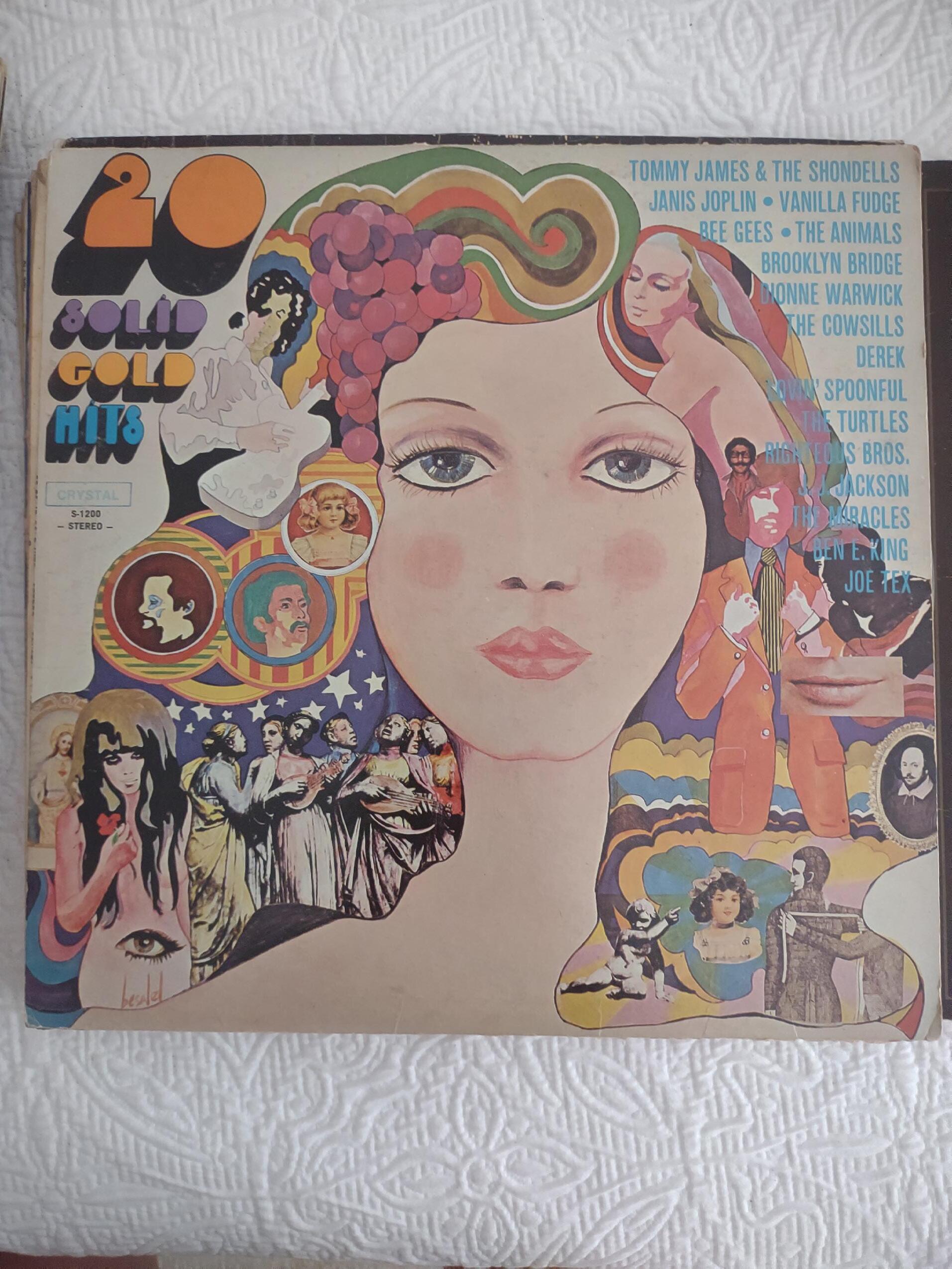 This was a record at my Nanny’s (my mom’s mom), and is my example of bad typography this week. Before I go on, I do like the overall design of this piece. My main focus will be on the last of the names written in blue (or teal?), primarily the bottom seven. The color choice doesn’t work, the colors are complimentary, but the contrast is too high and causes issues with readability. If the artist had played with shades and tints within the color scheme, they might have been able to resolve the problem with a very slight adjustment. Otherwise, if the text was not placed in front of the images making up the woman’s hair, I think it might have resolved this. I believe the text was kept in its place to flow and reflect the shape of the text on the left side of the cover and to fill the space, but that’s just my guess. This is definitely a busy piece of art, and while most of it works, the one little issue with the text being hard to read really pulls away from the whole design. I do want to add in that the fun font chosen for “20s solid gold hits” suits the theme of the design very well, the colors go well and the funky shapes and missing counter’s give a unique feel to the words.