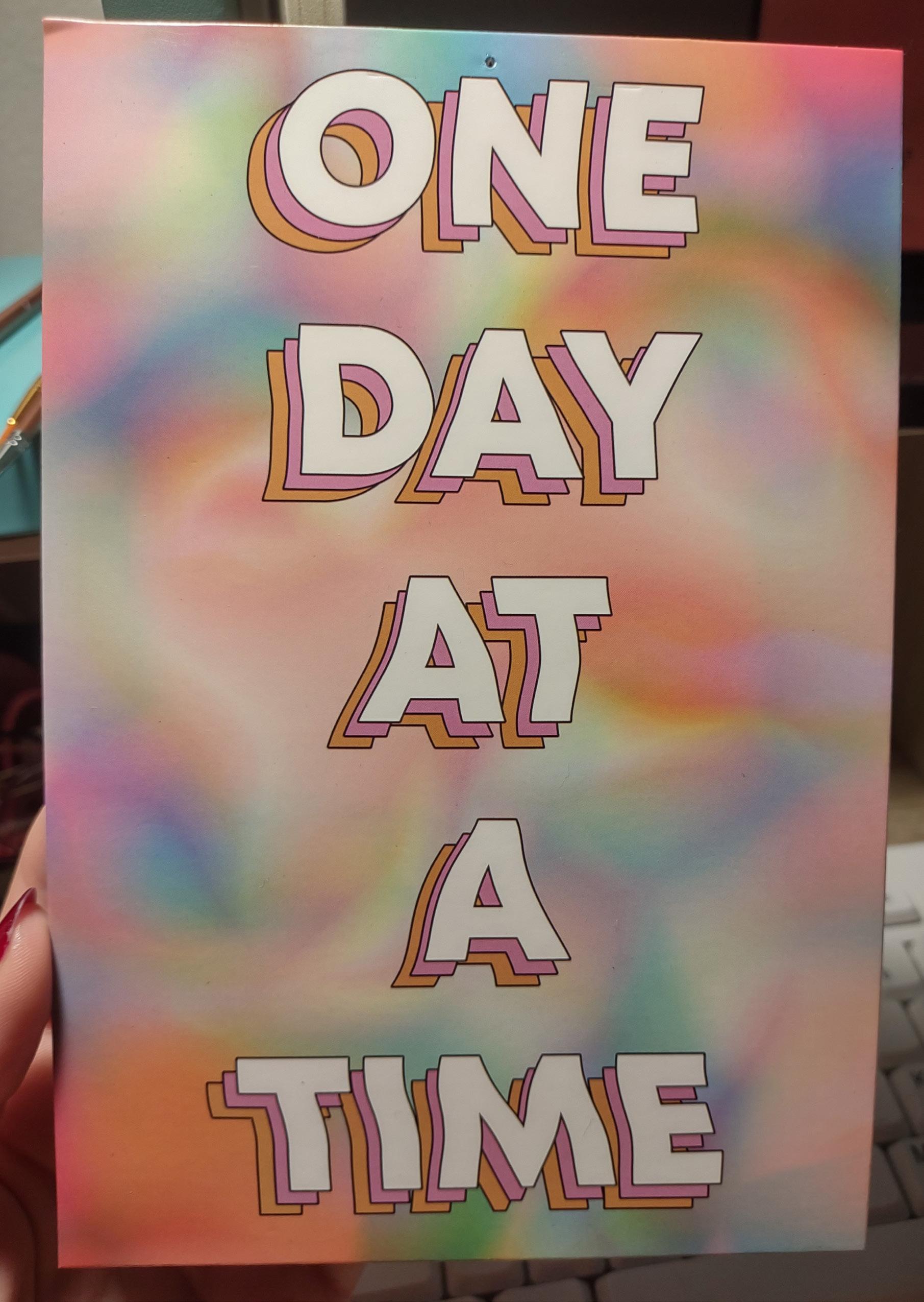 My sister gave me this little poster a while ago, I have kept it at my desk since. I love the layered wavy text, it is easy to read and feels like it is coming towards you (the reader, rather), or rather on its way to float past the reader’s right shoulder. I think it’s the blobby, undefined background compared to the bold text that gives this illusion. It is a simple message, but a kind one. The layered text, orange on bottom, then pink, then white on top, works well with the amorphous background. The background reflects the same colors as the layered text but differs in that a few cool tones have been added, I think this brings more contrast and allows a better figure ground relationship. Another thing that I appreciate about this is that the letters are not all wavy in the same way. The three As for example, in the three middle lines, all have the same base shape but have been distorted uniquely, the designer did not just copy and paste but treated each letter as its own form and kept it in relation to the letters next to, but not above or below said letter.