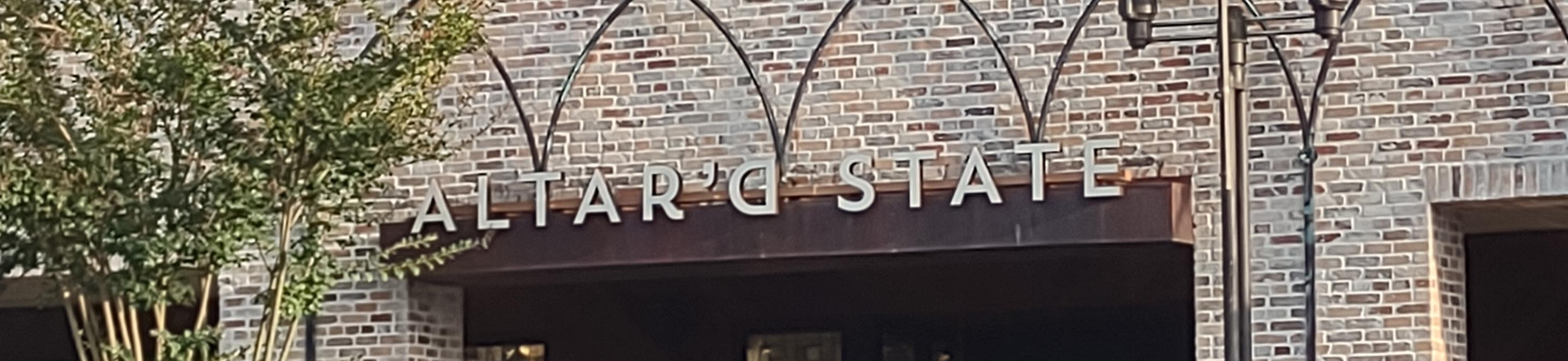 I met my cousin a week ago at Grand Boulevard to take some engagement photos for her, and caught this sign. It’s a nice area and I didn’t see any bad examples of typography, but this is the only thing that really jumped out at me. Altar’d State is a women’s clothing store. It doesn’t give much away from the title, other that it’s putting a modern twist on an otherwise plain sign. I initially thought it was “altered state”, as in alter-to change (a building) or tailor (clothing), but it is spelled “altar” as in a table or flat-topped block (religious, ritual sacrifices or offerings). After a little searching, they are a Christian organization: “Our mission is to serve as an inspiration, empower others and give more than we receive. We do this by lifting those who need a helping hand, volunteering our time to enrich lives, and extending the power of prayer.” (Quote found directly on their website, https:// www.altardstate.com/stand-out-for-good/).