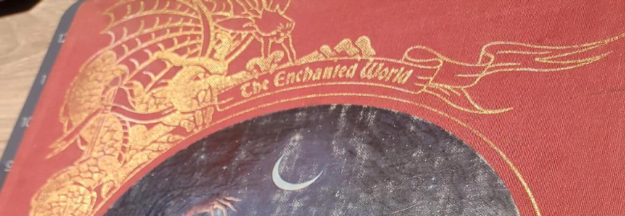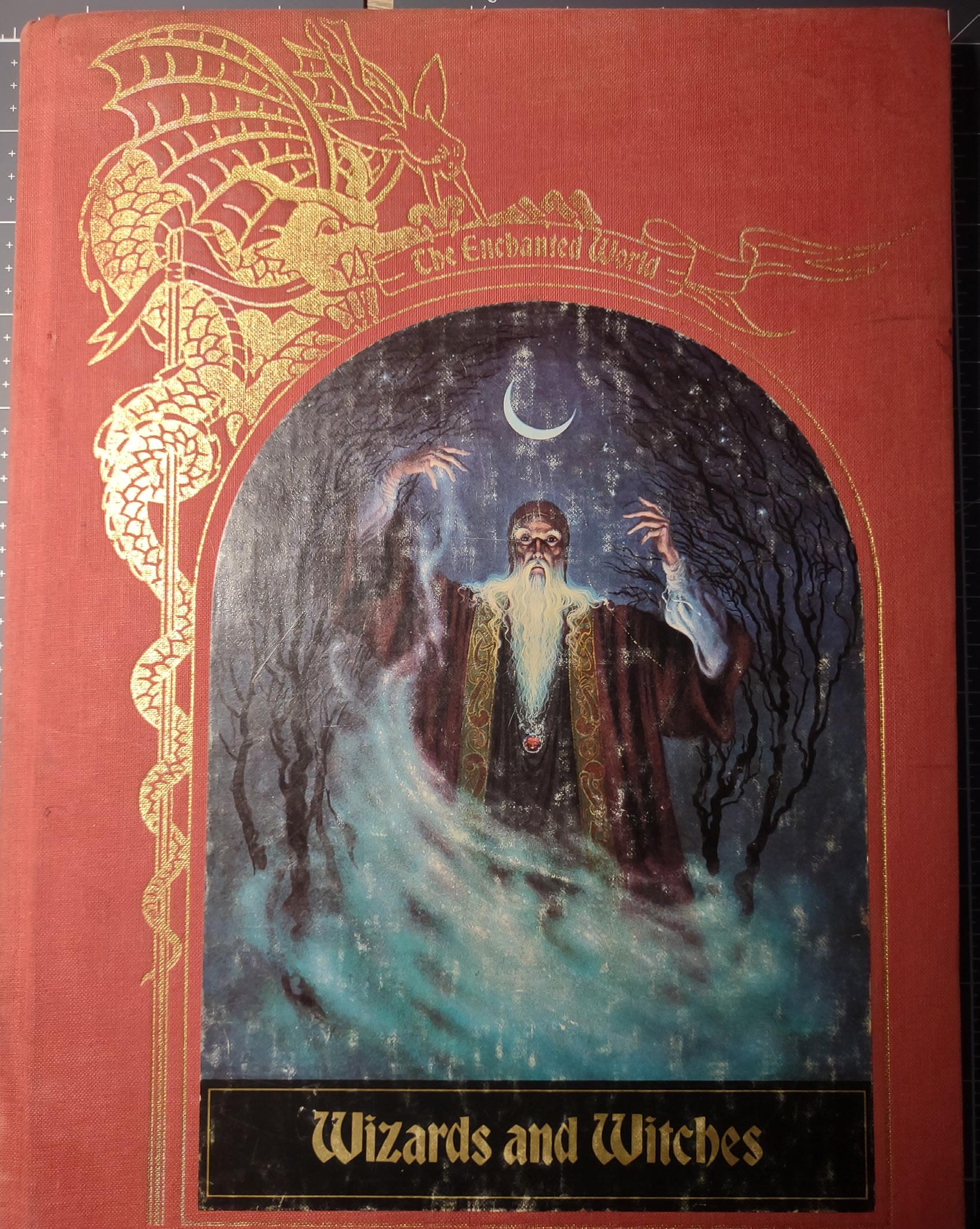This book is called “The Enchanted World, Wizards and Witches”, by Brendan Lehane and the Editors of Time-Life Books. This is a book I’ve had on my shelf for years but have never read more than a few pages. While I do like the gold lettering, it is a little difficult to read from the left but is easily read from the right. The font is the same, the difference between the reflective gold lettering of “The Enchanted World” and the yellow/tan lettering of “Wizards and Witches” does not sit very well with me. It did not bother me until I noticed the two were different, I wish they had the latter in gold lettering as well, I think it might pull the book cover together more. The arch with the wizard within feels a bit disjointed from the red background and the gold lettering and dragon. The amulet he wears does match the red background, but otherwise the image feels a little disjointed. I think there are several aspects here that would work together if tweaked slightly. For example, if the type was the same golden color, or if the red background was a deep blue or maybe even purple.