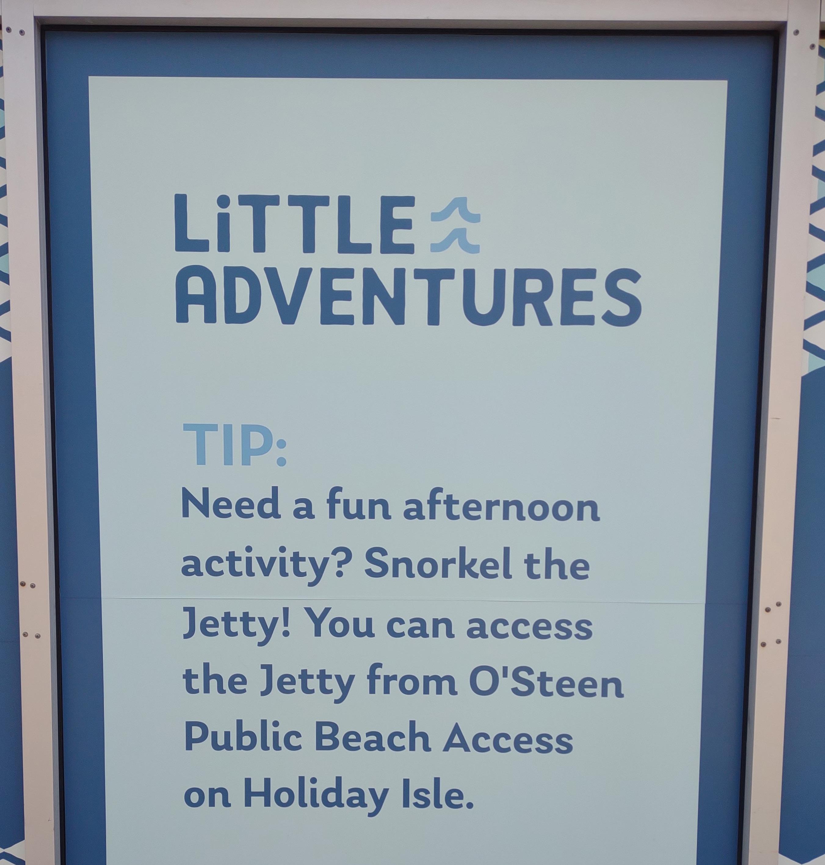 I was wondering around Destin Commons Thursday (06/08) morning, I was in the area for a vet appointment, and noticed they’ve added ideas on the walls for children’s activities for vacationing families. They call them little adventures. The announcements were clean and cute. I love this idea, they used a lowercase i within the title, “LiTTLE ADVENTURES” to include kids, the little ones if you will. It’s so wholesome. The rest of the characters are capitalized but the whole title is bold and sans-serif. It’s direct without feeling loud. It is easy to read, and the dark blue font against the light blue background feels gentle. I think the color was chosen for that reason as well as to reflect the water-based activities they offer. Upon further research, you scan a QR code on the sign (or look them up online) and sign up for the activities on your phone. I think the simplicity of this idea really shines through, once you start bringing multiple fonts and colors and text sizes into play, there can be so much visual clutter to process before you actually get the message. It feels like a breath of fresh air to see a simple idea work so well.