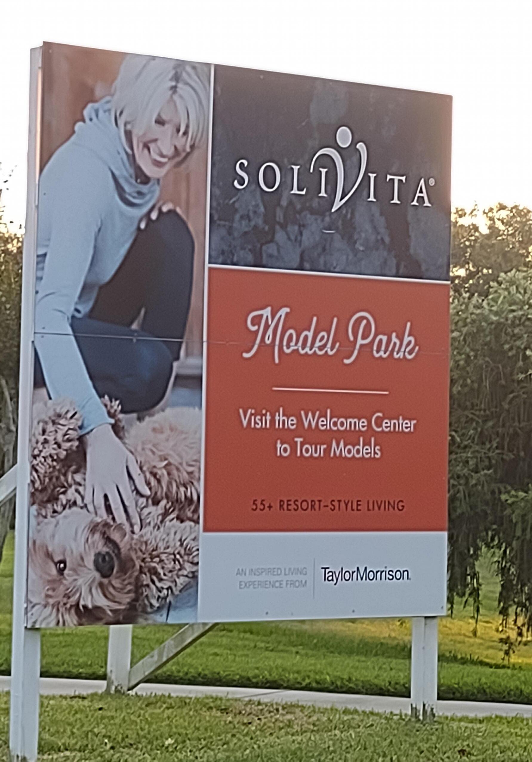I went to visit my Nanny, my mom’s mom, May 26th-29th. She lives in Solivita. Within Solivita there are little communities, those that have a “V” are designed just as the “V” in the photo shows (e.g., Terra Vista, Treviso, Alta Vista, etc.). I took this photo rather than one of the monument signs because of the mix of a softer font with a more rigid one. It reflects the stylized “V” nestled between the I’s within the capitalized, loosely tracked “Solivita”. The text is easy to read, and it is memorable. It helps a bit that there is also a Solivita Marketplace just across from the group of communities, the signs all bear the same style and it brings consistency to the whole area. The softer cursive of “Model Park” draws your eye down gently to show the offer of a tour through a model. Just below, in capitalized contrasting dark font, the “55+Resort-Style-Living” politely and firmly tells us this is a retirement community. Lastly, and lightly, the owner’s name. I think this sign is very well put together. It feels clean, it’s easy to read, and there’s a dog to look at. All jokes aside, it feels effortless, and it takes effort to give that kind of air.