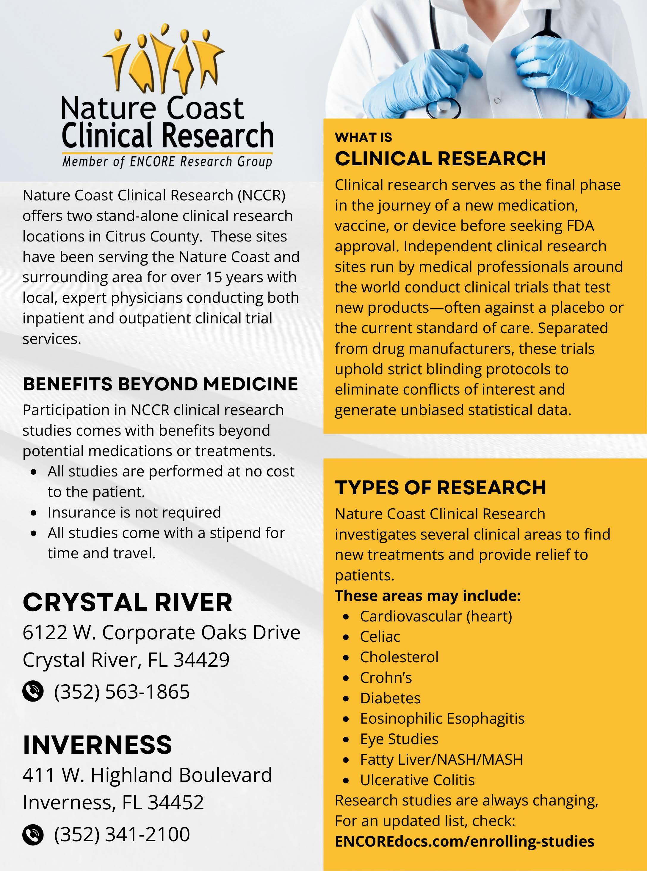 Nature Coast Clinical Research, Crystal River 29 encoredocs.com/nature-coast-clinical-research-crystalriver/ Nature Coast Ministries No Cost Dental Care Thrift Shop........................................................ 66 www.MyNCM.com