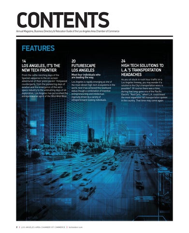 24 HIGH TECH SOLUTIONS TO L.A.’S TRANSPORTATION HEADACHES As you sit stuck in rush hour traffic on a Los Angeles freeway, you may wonder if a solution to the City’s transportation woes is possible? Of course there was a time, during that long-gone era of the Pacific Electric “Red Cars,” when L.A. could boast the most expansive rail transportation system in the country. That time may come again
