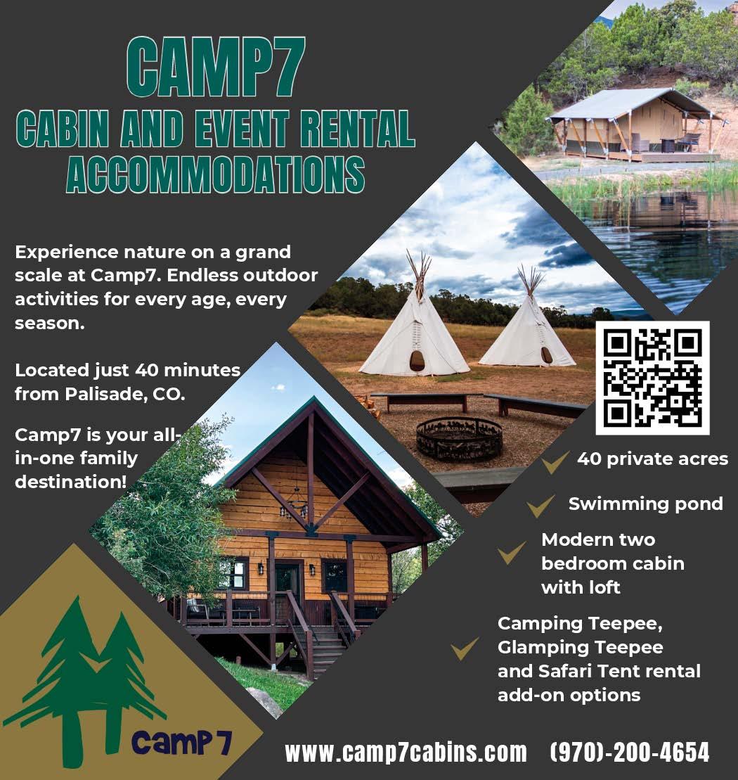 Camp7 is your all-in-one outdoor family getaway destination. Located just 40 minutes from Palisade, Colorado, Camp7 offers unique outdoor rental accommodations including a modern two bedroom cabin with loft, camping teepees, a glamping teepee and Safari Tents. Located on 40 private acres with expansive views, there are endless outdoor activities for every age, every season!
